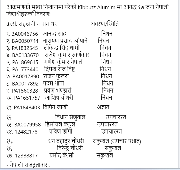 उनीहरुमध्ये १७ जना गाजा क्षेत्र नजिक दक्षिणी इजरायलको किबुज अलुमिम भन्ने क्षेत्रमा भएको आक्रमणमा परेको भन्दै परराष्ट्र मन्त्री साउदले भनेका थिए, ‘१२ जनामध्ये केही सम्पर्कमा नरहेको र केही हताहत भएको हुनसक्ने हुँदा स्थिति यकिन गर्न सम्पूर्ण संयन्त्र परिचालन गरिएको छ ।’