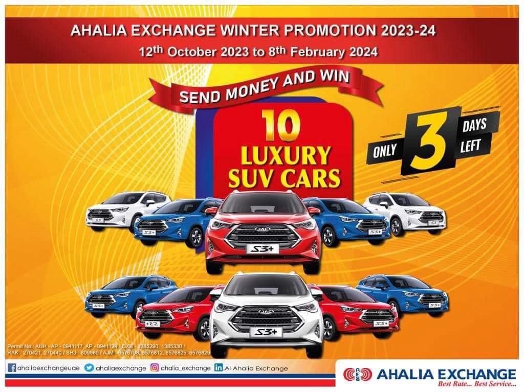 युएई । अल अहलिया एक्सचेन्ज युएईले आफ्ना ग्राहक लक्षित विन्टर प्रोमोसन योजना सार्वजनिक गरेको छ । अक्टोवर १२ देखि फेब्रवरी ८ तारिखसम्म चल्ने यो प्रोमोसनमा सहभागी ग्राहकले १० वटा लक्जरी कार जित्न सक्ने एक्सचेन्जका बजार व्यवस्थापक सुर्दशन जोशीले जानकारी दिए ।