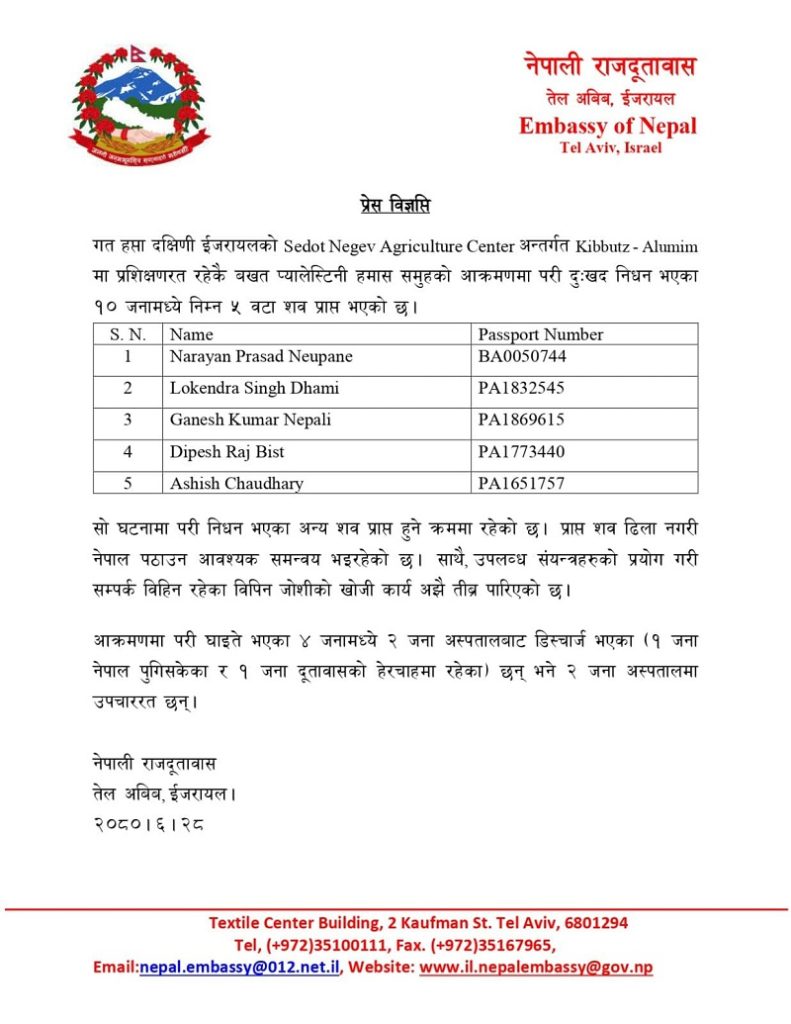 तेल अभिभमा रहेकाे नेपाली दूतावासले एक विज्ञप्ति निकालेर यसबारे जानकारी दिएकाे हाे । आक्रमणमा ज्यान गुमाएकामध्ये नारायणप्रसाद न्याैपाने, लाेकेन्द्रसिंह धामी, गणेशकुमार नेपाली, दिपेशराज विष्ट र आशिष चाैधरीकाे शव प्राप्त भएकाे दूतावासले जनाएकाे छ ।