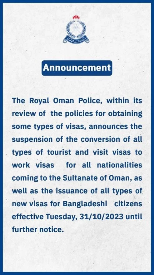 ओमानले विशेषगरी बंगलादेशी नागरिकहरूलाई सबै प्रकारका भिसा नदिने निर्णय गरेको छ । अर्को सूचना जारी नहुँदा सम्म यो नीयम लागु हुने छ । मस्टकस्थित नेपाली राजदूतावासले नेपालीहरूलाई समेत सचेत गराएको छ ।