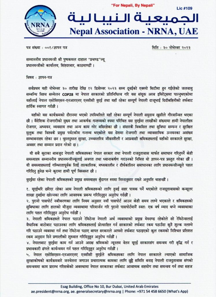 एनआरएन युएईका कार्यबहाक अध्यक्ष मनोजकुमार सैजु सहितको टोलीले प्रधानमन्त्री प्रचण्डलाई ज्ञापन पत्र बुझाएको हो । त्यस्तै नेपाली समाजका अध्यक्ष वेदप्रसाद अर्यालको नेत्रित्वमा रहेको टोलीले साइडलाइनमा प्रधानमन्त्री प्रचण्डलाई ज्ञापन पत्र बुझाएको हो ।