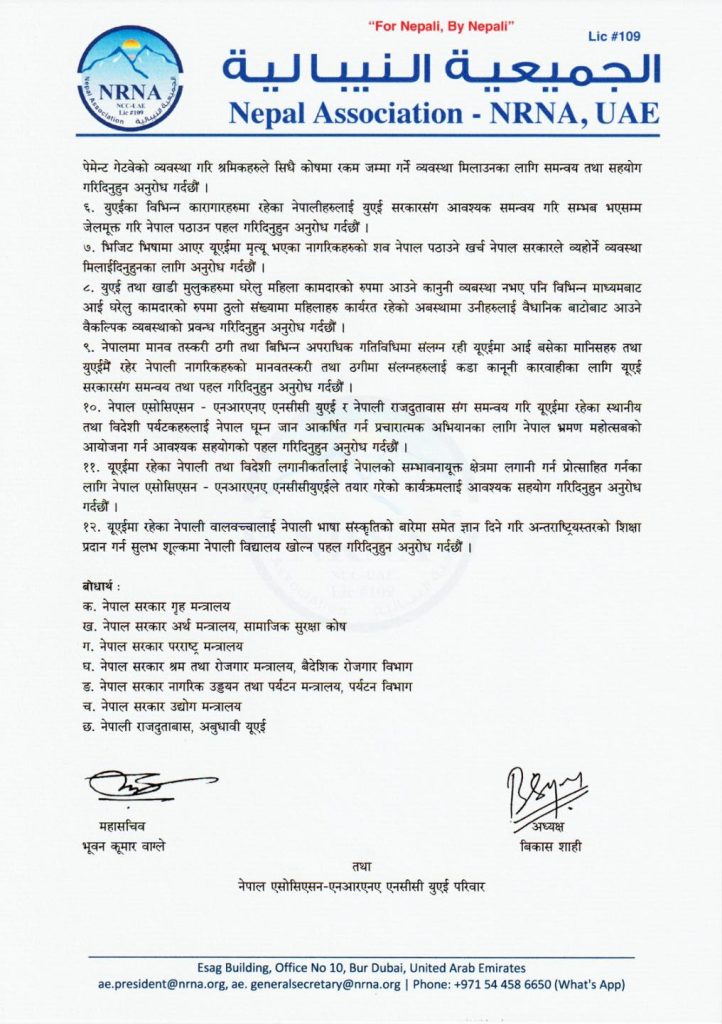 कार्यक्रममा युएईका लागि नेपाली राजदुत तेजबहादुर क्षेत्रीले प्रधानमन्त्री प्रचन्डको युएई भ्रमण सफलताको कामना सहित दुतावासले गरेका मुख्य गतिबिधी बारे प्रकाश पारेका थिए । श्रम काउन्सिलर दिनबन्दु सुवेदीले सन्चालन गरेको कार्यक्रममा एनआरएन युएईले १२ बुदे तथा नेपाली समाज युएईले साइडलाइनमा २० बर्षदेखी दुबई जेलमा रहेका अमरबहादुर बमको उद्दारका लागि एक बुदे ज्ञापन पत्र बुझाएका थिए ।