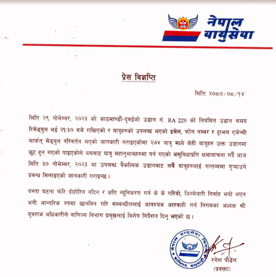 नेपाल एयरलाइन्सको फ्लाइट नम्बर ‘आरए २२९’ जहाजले बुधबार राति प्रधानमन्त्री पुष्पकमल दाहाल प्रचण्डलाई लिएर दुबई जाने क्रममा सोही उडानमा टिकट काटेका ३१ जना यात्रुलाई काठमाडौंमै छाडेको थियो । ती यात्रुहरुलाई होटलमा लगेर राखिएको थियो । सो सम्बन्धी बिभिन्न संचारमाध्यममा समाचार प्रकाशित भएपछि निगमले माफि मागेको हो ।