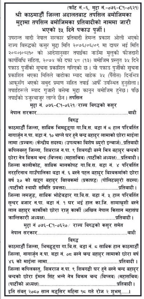 जिल्ला अदालत काठमाडौंले सोमबार गोरखापत्रमा प्रकाशन गरेको ३५ दिने सूचनामा नेकपाका महासचिव विप्लव, पोलिटब्यूरो सदस्य खड्गबहादुर विश्वकर्मा, माइला लामा, अखिल नेपाल किसान महासंघका अध्यक्ष राजु कार्कीको नाममा अदालतमा उपस्थित हुनका लागि आग्रह गरिएको छ ।