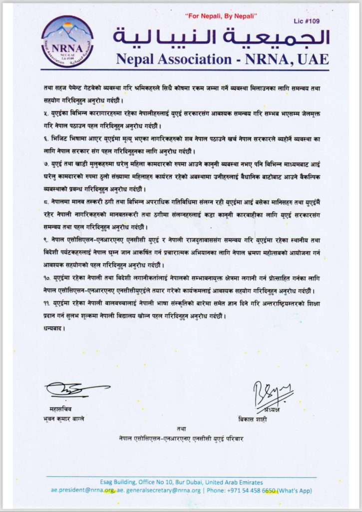 एनआरएन (नेपाल एसोसीएसन) युएईले पछिल्लो ६ महिनामा गरेका सामाजिक कार्यहरुको प्रगती विवरण समेत प्रस्तुत गरिएको थियो । तथ्याकं अनुसार एनआरएन युएईको वर्तमान कार्यसमितिले यहाँ ज्यान गुमाएकी एक महिलाको शब नेपाल पठाएको सहित, १३ जना नेपालीलाई उद्दार गरी कागजात एवम हवाई टिकट प्रदान गरिएको उल्लेख छ ।