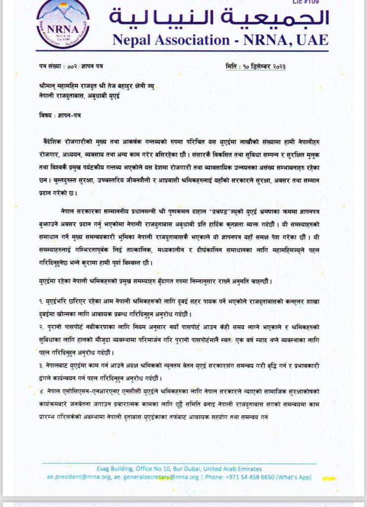 चौथो पूर्ण राजदुतका रूपमा युएई आएका राजदुत क्षेत्रीलाई स्वागत गर्न एनआरएन युएईले यहाँका संघसस्थाको सहभागीतामा आइतबार दुबईमा आयोजना गरेको कार्यक्रममा बोल्दै राजदुत क्षेत्रीले नेपालीलाई परेको समस्या सक्दो छिट्टो दुतावासलाई जानकारी गराएर सहयोग गर्न संघसस्थालाई आग्रह गर्दै यहाँ कार्यरत नेपालीलाई कानुनी सचेतना आवश्यकता भएको उल्लेख गरे ।