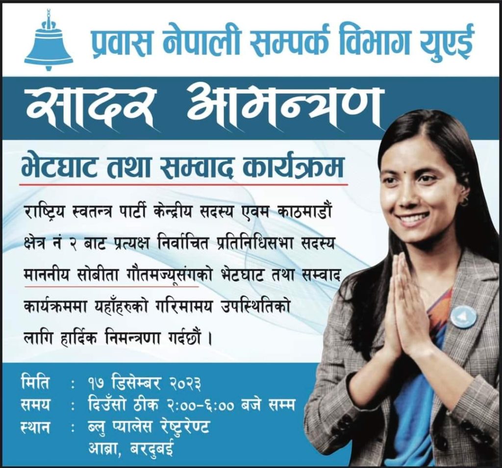 दुबई । राष्ट्रिय स्वतन्त्र पार्टीकी केन्द्रिय सदस्य नेत्री सोवीता गौतम युएई आउने भएकी छन । काठमाण्डौं क्षेत्र नम्बर २ कि प्रत्यक्ष नीर्वाचित प्रतिनिधि सभा सदस्य गौतम शनिबार युएई आउने भएकी हुन ।