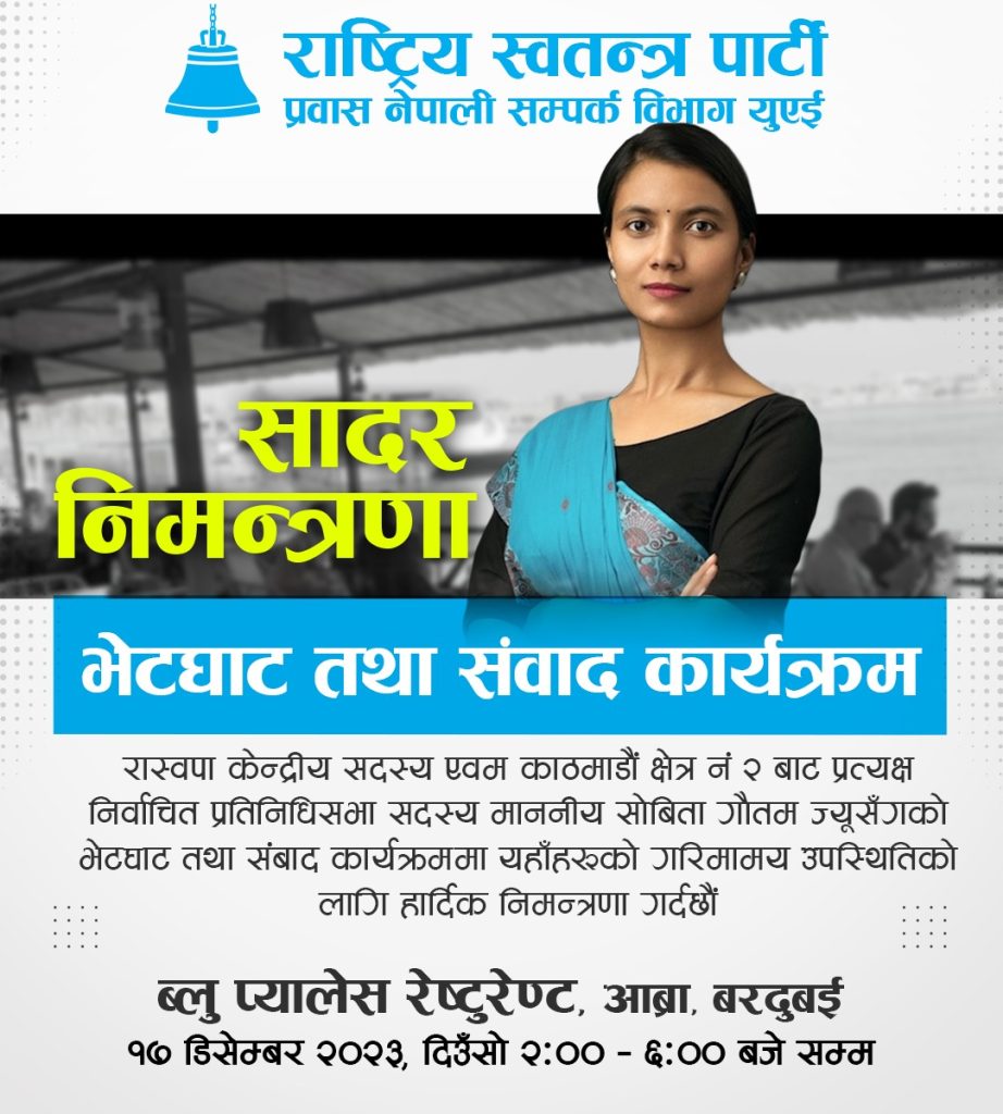 युएईमा रहेका नेपाली संघसस्था तथा आम नेपाली समुदायलाई उपस्थितिका लागि अनुरोध गरिएको पार्टिका युएई सभापती सुजन थापाले जनाएका छन ।