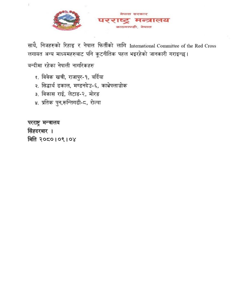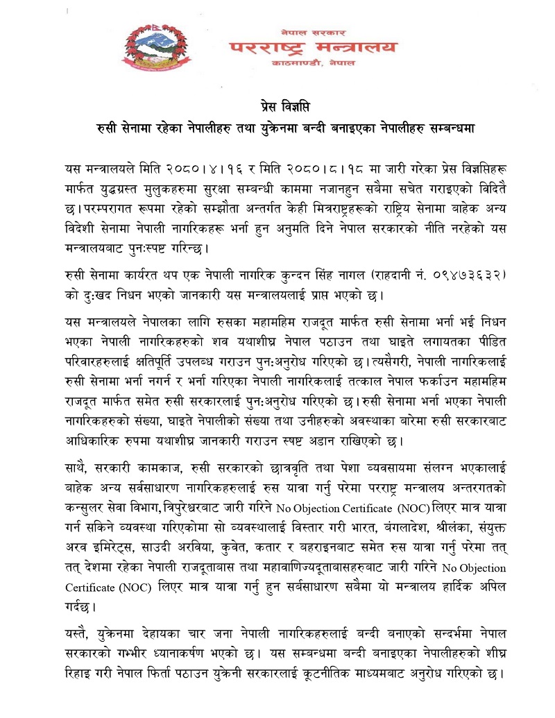 काठमाण्डाै – रुस यात्रा गर्नुपरेमा नो अब्जेक्सन लेटर अर्थात् एनओसी अनिवार्य रुपमा लिनुपर्ने भएको छ । परराष्ट्र मन्त्रालयले बुधवार निकालेको विज्ञप्तिमा रुस यात्रा गर्नु परेमा एनओसी अनिवार्य रुपमा लिनुपर्ने प्रावधान रहेको जानकारी दिएको हो ।