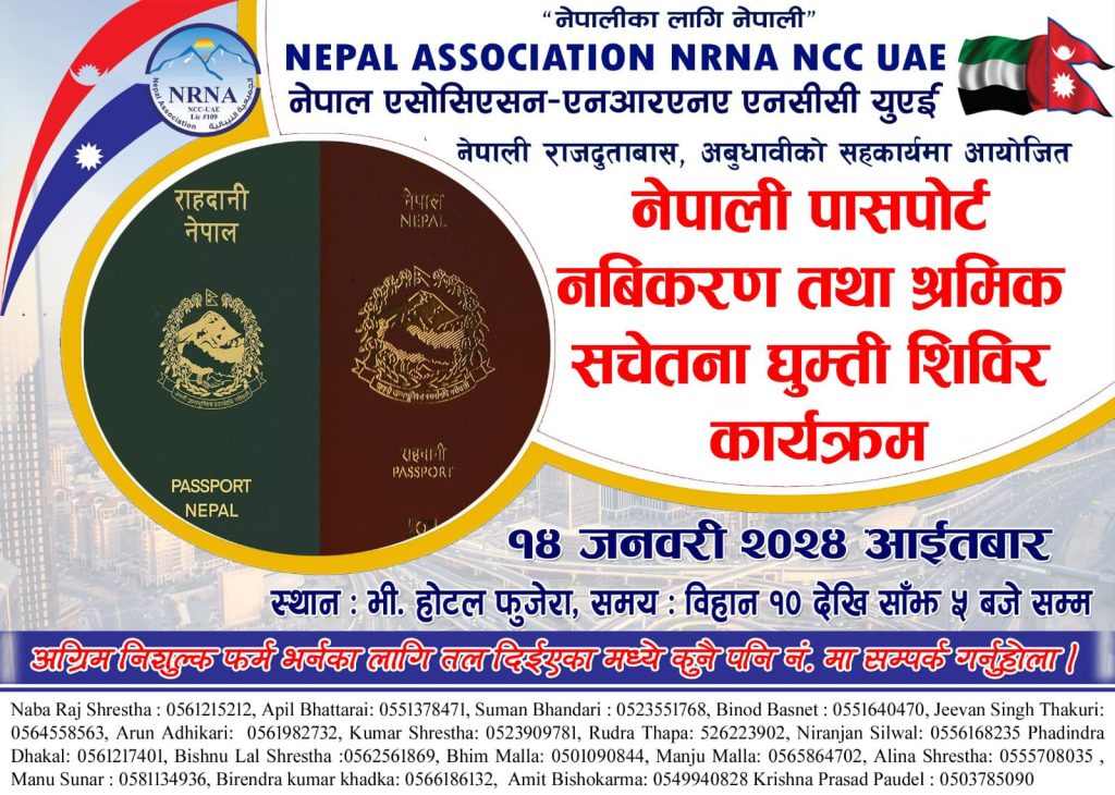 एनआरएन युएईले फुजेराहको भी होटलमा १४ जनवरी आइतबारका दिन घुम्ती सेवा सँगै उपस्थितमाझ सचेतना कार्यक्रम समेत गर्न लागेको अध्यक्ष विकास शाहीले बताए ।