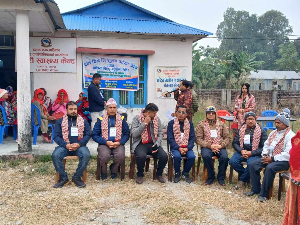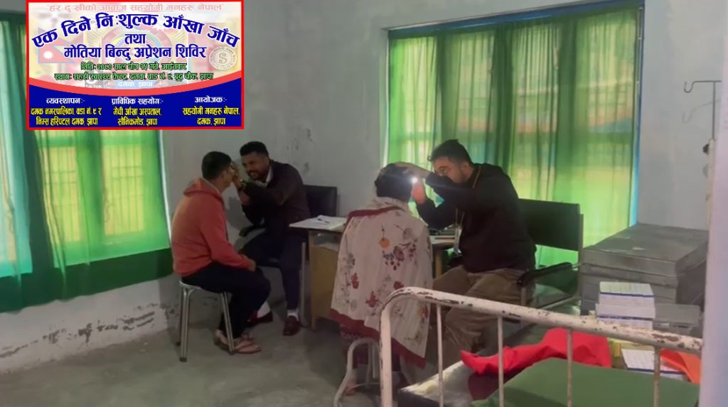 दमक नगरपालिका ९ नम्बर वडा कार्यालय, निम्स हस्पिटल दमकको व्यवस्थापन र मेची आँखा अस्पताल बिर्तामोडको प्राविधिक सहयोगमा आयोजना गरिएको विशेषज्ञसहितको शिविरमा २ सय ९२ जनाले स्वास्थ्य सेवा लिएका छन् । जसमध्ये २५ जनामा मोतियाविन्दु फेला परेको छ ।