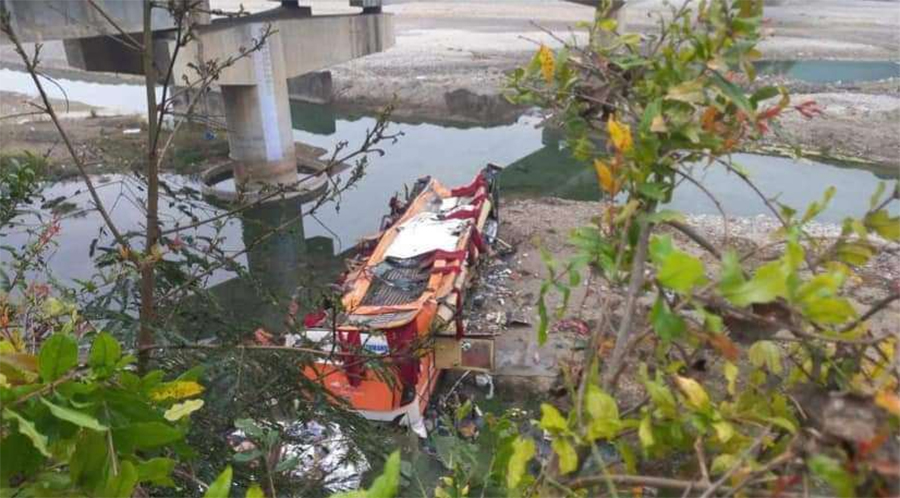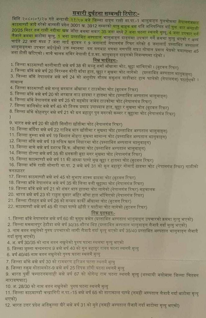 बाँकेको नेपालगञ्जबाट काठमाडौं आउँदै गरेको भे१ख ३९१२ नम्बरको बस शुक्रबार राति साढे १० बजेतिर पुलबाट तल राप्ती नदीमा खसेको थियो ।