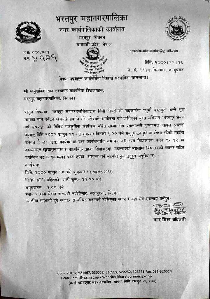 भरतपुर महानगरका नगर शिक्षा अधिकारी महेन्द्रप्रसाद पौडेलले पत्र पठाएर नगरपालिका भरिका सामुदायिक र संस्थागत विद्यालयलाई कक्षा ९ देखि १२ सम्मका विद्यार्थी र माध्यामिक तहमा पढाउनेलाई र्यालीमा सहभागी गराउन सम्बन्धित विद्यालयलाई पत्राचार गरेका हुन् ।