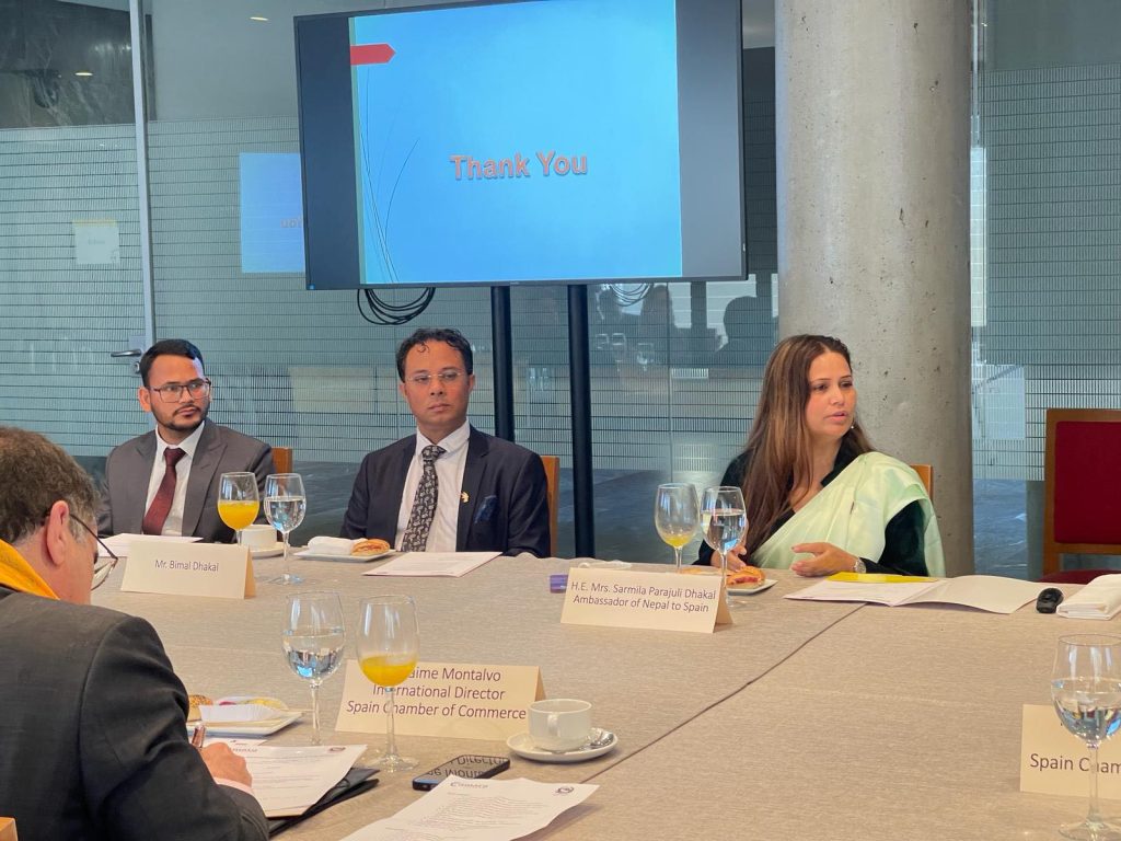 स्पेनको राजधानी म्याड्रिडमा बुधबार स्पेन चेम्बर अफ कमर्सका लगानीकर्ताहरूसँग भेटवार्ता गर्दै स्पेनका लागि नेपाली राजदूत पराजुलीले लगानी सम्मेलनमा सहभागिताका लागि आग्रह गरेकी हुन् ।