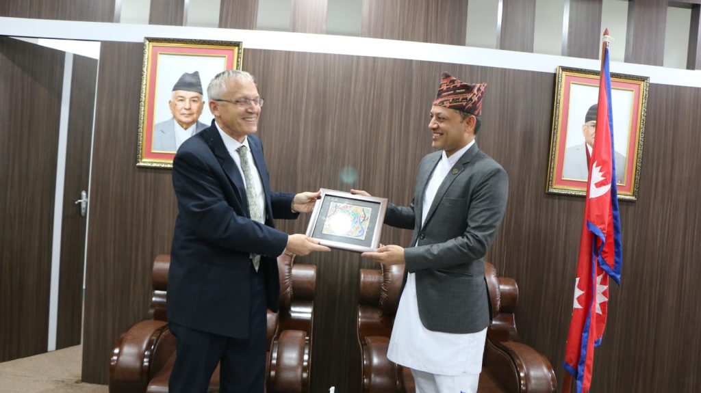 काठमाण्डौ । श्रम, रोजगार तथा सामाजिक सुरक्षा मन्त्री डोल प्रसाद अर्यालले नेपालका लागि इजरायलका राजदुतलाई आफ्नै कार्यकक्षमा बोलाएर भेटेका छन । नेपालस्थित इजरायली राजदूत हनन गोडेर गोल्डबेर्गर बीच मन्त्रालयमै शिष्टाचार भेट गरेको मन्त्रालयले जनाएको छ ।