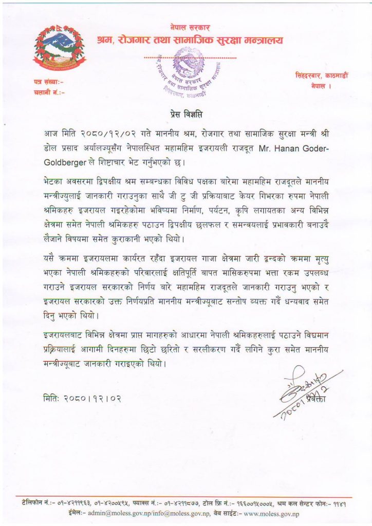 यसै क्रममा इजरायलमा कार्यरत रहँदा इजरायल गाजा क्षेत्रमा जारी द्वन्दको क्रममा मृत्यु भएका नेपाली श्रमिकहरुको परिवारलाई क्षतिपूर्ति बापत मासिकरुपमा भत्ता रकम उपलब्ध गराउने इजरायल सरकारले निर्णय गरेको राजदूत बेर्गरले मन्त्रीलाई जानकारी दिए ।