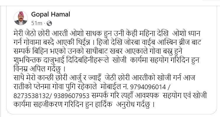 उनले लेखेका छन्, ‘उनी केही महिनादेखि ओशो ध्यान गर्न गोवामा बस्दै आएकी थिइन् । हिजोदेखि जोरबा वाइब आस्बिन ब्रिजबाट सम्पर्कविहीन भएको उनको साथीबाट खबर आएकाले गोवा बस्नुहुने शुभचिन्तक दाजुभाइ दिदीबहिनीहरूले खोजी कार्यमा सहयोग गरिदिन हुन विनम्र अपिल गर्दछु ।’