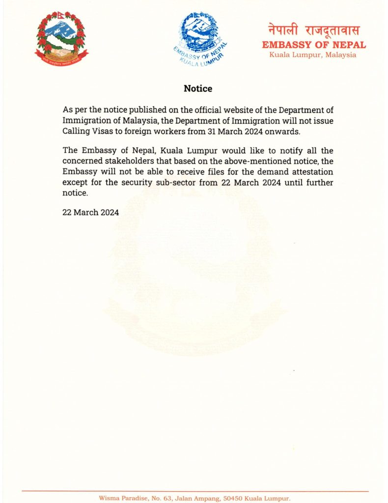 दूतावासले मलेसियाको उक्त सूचनाका कारण अर्को सूचना नभएसम्मका लागि सुरक्षा क्षेत्र (सेक्यूरिटी गार्ड) बाहेकका कामदारको भिसा प्रक्रियाका लागि फाइल लिन नसकिने उल्लेख गरेको छ ।