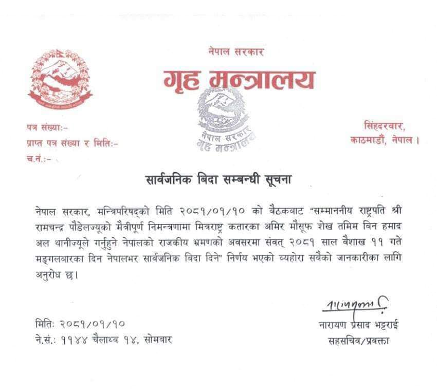 काठमाडौं । कतारका राजा नेपाल भ्रमणमा आउने दिन सरकारले भोलि मंगलबार सार्वजनिक बिदा दिएको छ ।