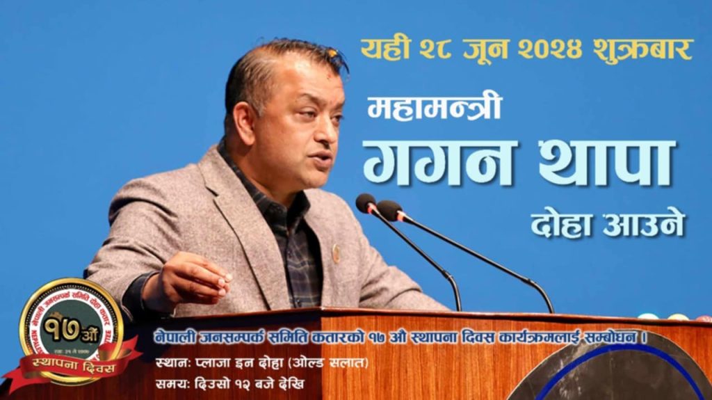 दोहा । नेपाली कांग्रेसका महामन्त्री तथा संघीय सांसद गगन थापा शुक्रबार कतार आउँदै छन् । नेपाली जनसम्पर्क समिति कतारले आयोजना गरेको १७ औं स्थापना दिवसको कार्यक्रमलाई सम्बोधन गर्न उनी कतार आउन लागेका हुन् ।