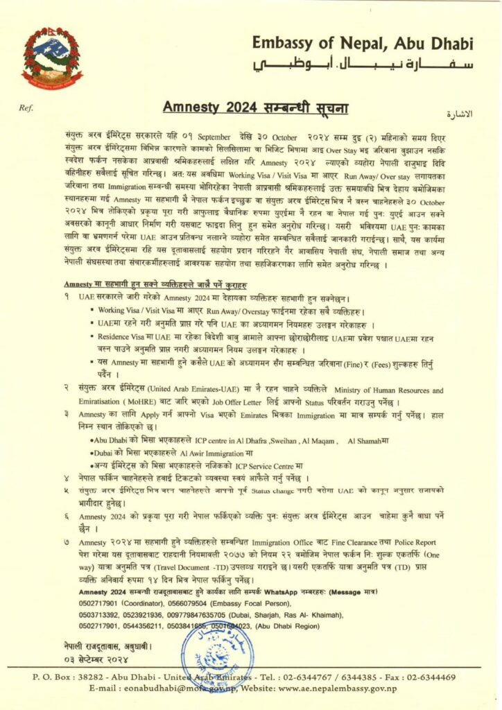 आममाफीमा सहभागी भइ आफ्नो भिसा स्टाटस परिवर्तन गरी यहीँ रहन वा स्वदेश फर्कन सक्ने युएई सरकारले जनाएको छ । कागजी प्रकृया पुरा गरी यहीँ काम गर्न चहानेहरुको हकमा भने जब अफर लेटरको आवश्यकता पर्नेछ ।