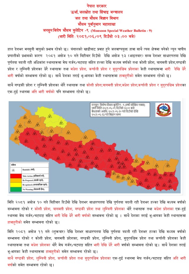 कोशी, बाग्मती, गण्डकी र लुम्बिनीका धेरै स्थान तथा मधेश, कर्णाली र सुदूरपश्चिमका केही स्थानमा ठूलाेदेखि अति ठूलाे वर्षाको सम्भावना छ । गण्डकी र लुम्बिनीका थोरै तथा कोशी, बाग्मती, मधेश, कर्णाली र सुदूरपश्चिमका एक/दुई स्थानमा भने अति ठूलो तहको वर्षाको सम्भावना छ ।