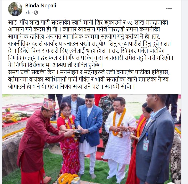 व्यापार व्यवसाय गर्नेले पारदर्शी रुपमा कम्पनीको सामाजिक दायित्व अन्तर्गत सामाजिक काममा सहयोग गर्नु कर्तव्य नै भए पनि राजनीतिक दलले कार्यालय बनाउन यस्तो सहयोग लिनु र व्यापारीले दिनु दुवै गलत भएको विन्दा पाण्डेले फेसबुकमा उल्लेख गर्नुभएको छ ।