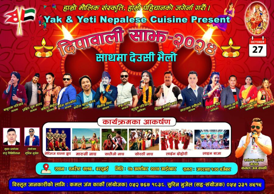 दुबई । दुबईमा तिहार (दिपावली)को अवसर पारेर दिपावली सांझ हुने भएको छ । दुबईको अलकुजमा रहेको याक एन्ड यती नेपाली रेस्टुरेन्टको मुख्य प्रायोजनमा देउसी भैलो तथा दिपावली सांझ आयोजना गर्न लागिएको हो ।