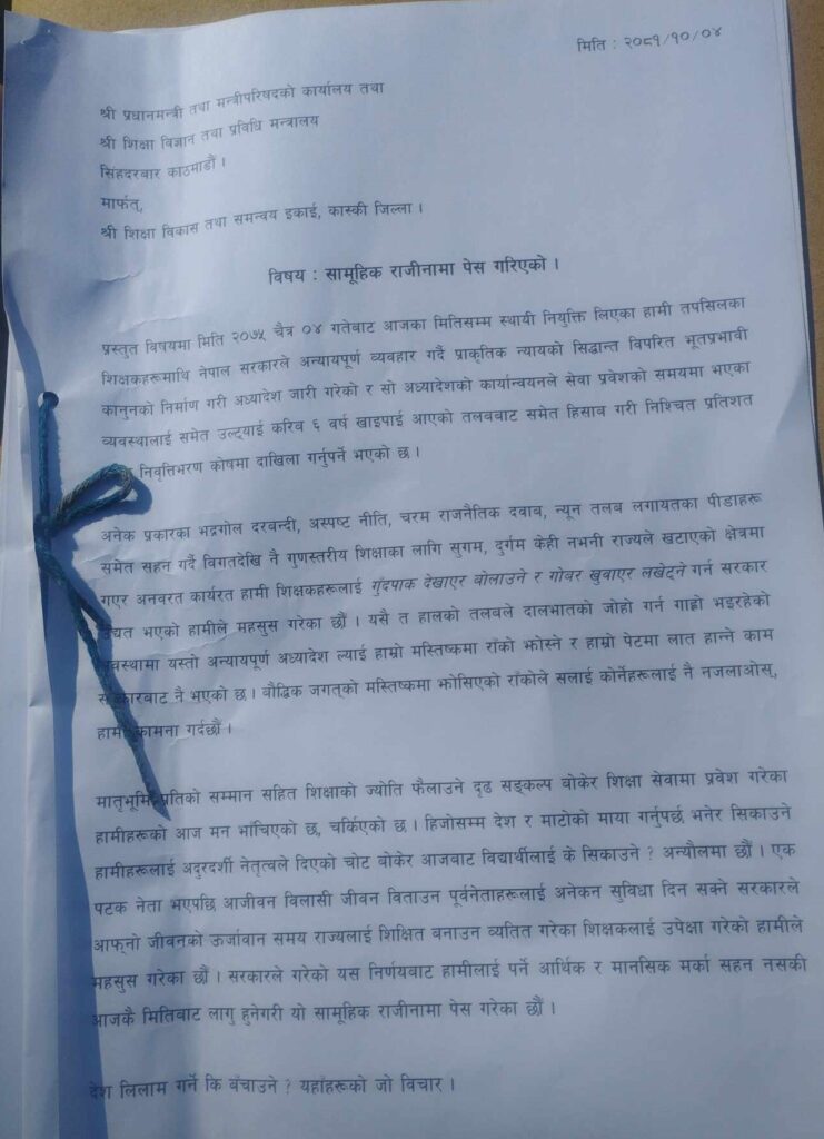 सरकारले ल्याएको अध्यादेशको विरोध गर्दै शिक्षामन्त्री विद्या भट्टराईको जिल्लाका ३५ स्थायी शिक्षकले सामूहिक राजीनामा दिएका छन् । कास्कीका ३५ शिक्षकले शुक्रबार शिक्षा विकास तथा समन्वय इकाइमार्फत शिक्षा मन्त्रालयमा राजीनामा पेस गरेका हुन् ।