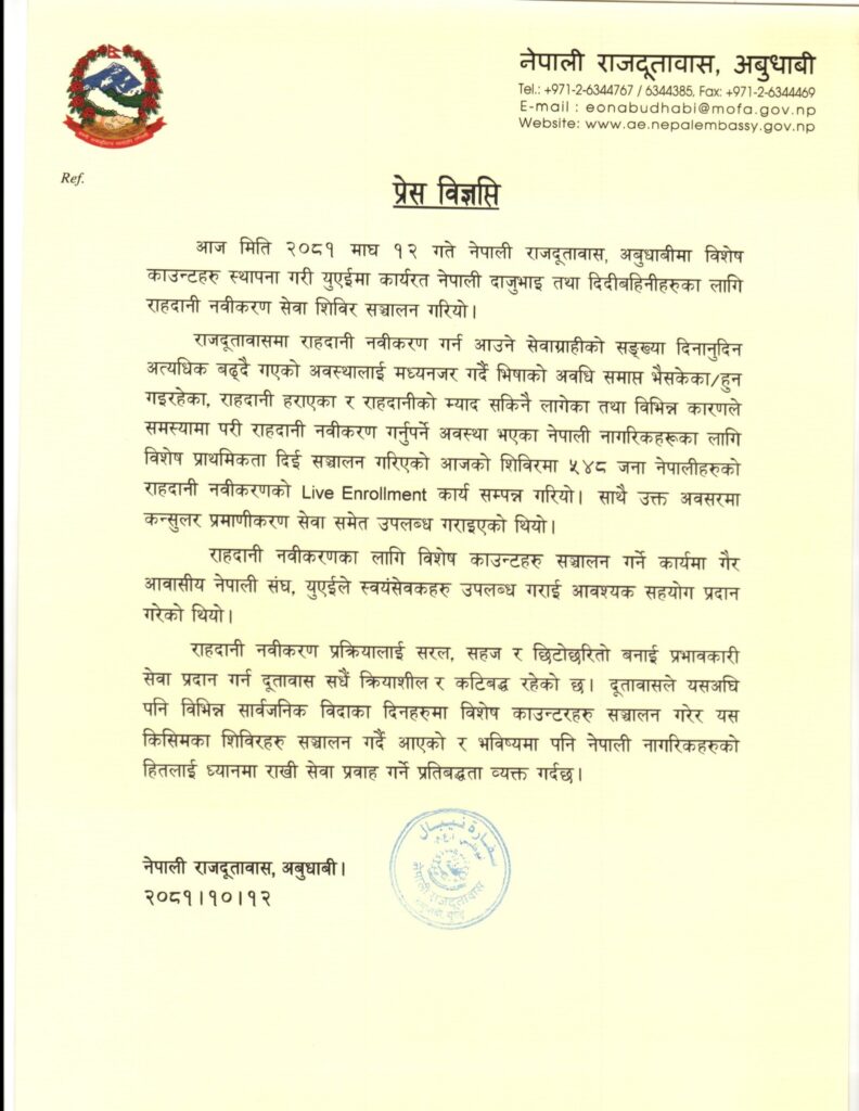 नेपाली दुतावास आबुधाबीले संचालन गरेको विषेश राहदानी नवीकरण सेवाबाट ५ सय ४८ जनाले लाभ लिएका छन् ।
