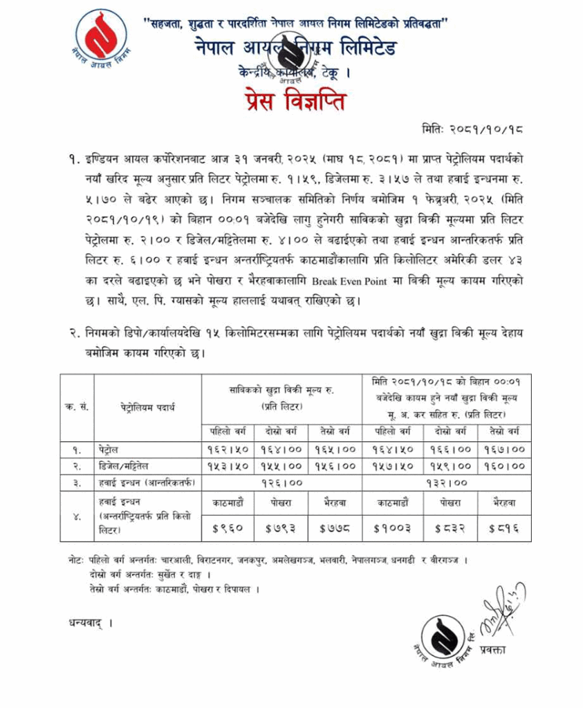 त्यस्तै, हवाई इन्धनको मूल्य पनि बढाइएको निगमले जनाएको छ । निगमका अनुसार हवाई इन्धन आन्तरिकतर्फ प्रतिलिटर ६ रुपैयाँ र अन्तर्राष्ट्रियतर्फ काठमाडौंका लागि अमेरिकी डलर ४३ का दरले मूल्यवृद्धि भएको छ ।