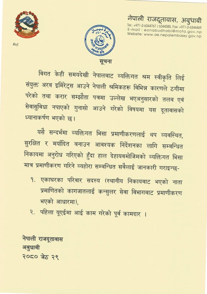 हाअ/युएई – नेपालबाट हुने व्यक्तिगत श्रम स्वीकृतिमा कामदारहरु ठगीमा परेको गुनासो प्रति नेपाली दुतावास आबुधाबीले चासो देखाएको छ ।
