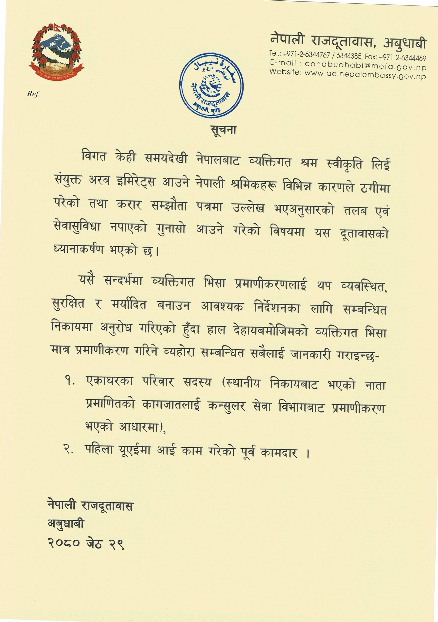 व्यक्तिगत भिसा प्रमाणीकरणका लागि एकाघरका परिवार सदस्य ( स्थानीय निकायबाट भएको नाता प्रमाणितको कागजातलाई कन्सुलर सेवा विभागबाट प्रमाणीकरण भएको आधारमा र पहिला यूएईमा आई काम गरेको पूर्व कामदारको हकमा मात्र भिसा प्रमाणीकरण गरिने दुतावासका सुचना अधिकारी भुवन ओझाले हालखबरअनलाइनलाई जानकारी दिए ।