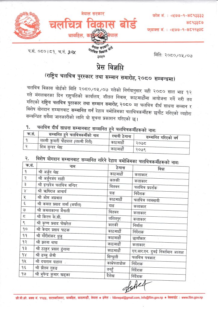 राष्ट्रिय चलचित्र पुरस्कार तथा सम्मान समारोहका लागी छनौटमा परेका ब्याक्तिहरुको सूची जारी गर्दै बोर्डले आगामी मंगलबार रास्ट्रपतिको हातबाट “बिशेष योगदान सम्मान” द्वारा ढकाल र ढुङ्गानालाई सम्मान गर्न लागेको जनाएको छ ।