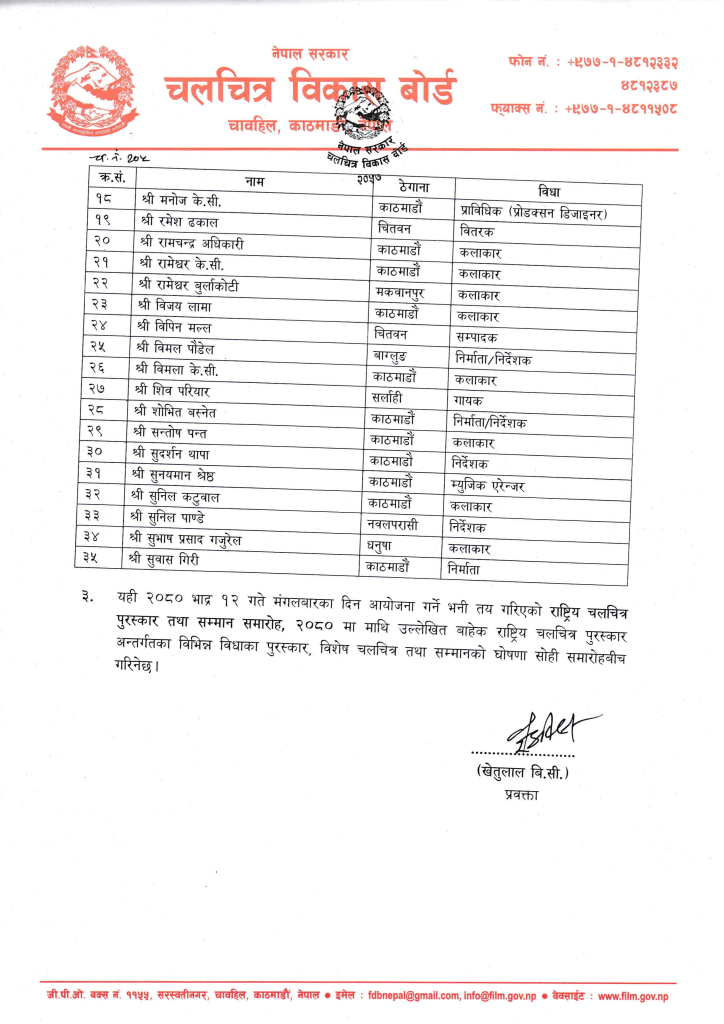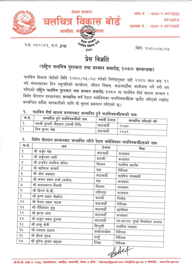 बोर्डले एक सूचना जारी गर्दै छनौटमा परेका ३७ जनाको नामावली प्रकाशन गरेको छ । विकास बोर्डले जारी गरेको सूचिमा दुई जनालाई चलचित्र दीर्घ साधना सम्मान र बाँकी ३५ जनालाई विभिन्न योगदान सम्मान द्वारा सम्मान गर्न लागेको उल्लेख छ ।