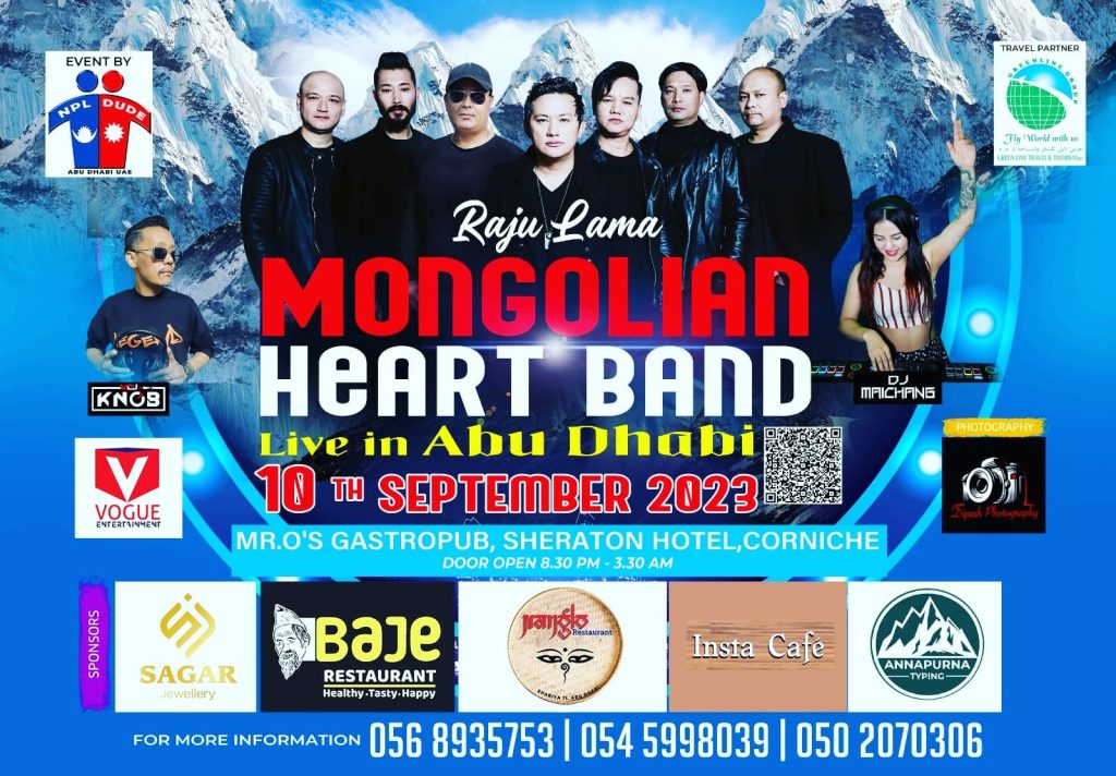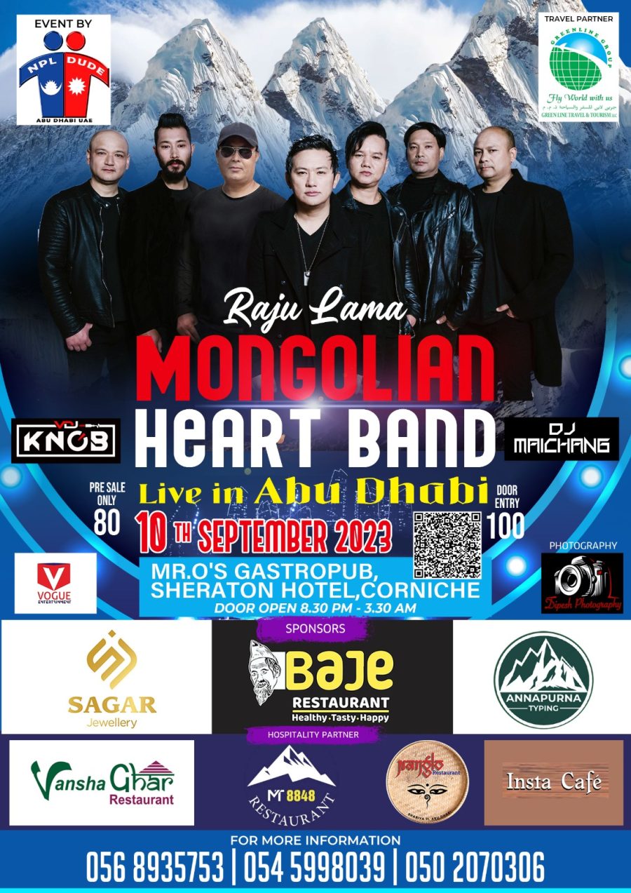 आबुधावी – चर्चित गायक राजु लामा सहित मङगोलीयन हर्ट ब्याण्डले आबुधावीमा धमकेदार प्रस्तुती गर्ने भएको छ । सेप्टेम्बर ९ दुबईको याक एण्ड यती क्लब तथा १० तारिक आबुधावीको ५ तारे होटल सेराटन कर्निसमा साङगितिक कार्यक्रम हुन लागेको हो ।