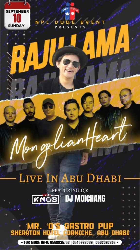 आबुधावीको नेपाली डुड नामक इभेन्ट समुहले आयोजना गर्न लागेको सो कार्यक्रमको लागी गायक राजु लामा सहित मङ्गोलीयन हर्ट ब्यान्ड आउन लागेको हो ।