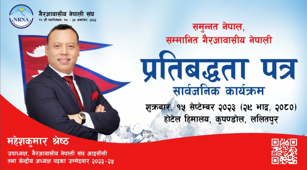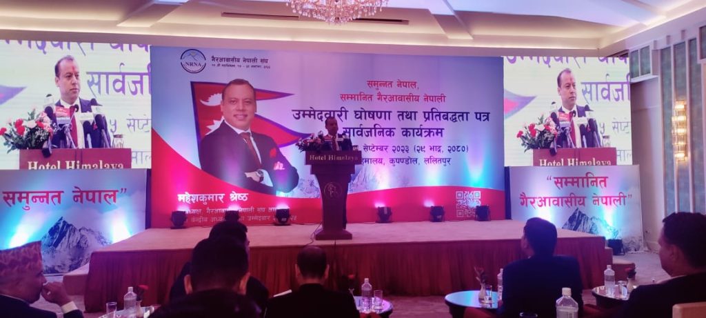 गैर आवासीय नेपाली संघ(एनआरएनए)को अध्यक्षकालागी महेश श्रेष्ठले शुक्रबार उम्मेदवारी घोषणा गरेका छन । श्रेष्ठले ललितपुरको कुपन्डोलस्थित होटल हिमालयमा पत्रकार सम्मेलन गरी उम्मेदवारी घोषणा गरेका हुन ।
