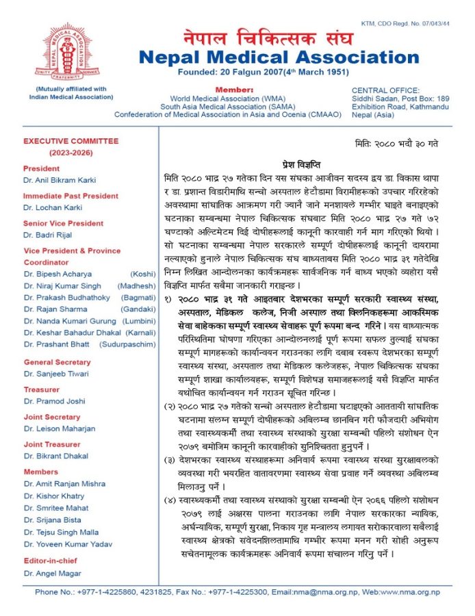सरकारी स्वास्थ्य संस्था, अस्पताल, मेडिकल कलेज, निजी अस्पताल तथा क्लिनिकहरूमा आकस्मिक बाहेकका सबै सेवाहरू पूर्ण रूपमा बन्द गर्ने सङ्घले जनाएको छ । गएको २७ गते सञ्चो अस्पतालमा कार्यरत डा. विकास थापा र डा. प्रशान्त बिडारीमाथि कुटपिट भएको थियो ।