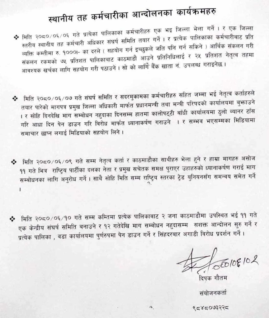 ‘स्थानीय तह कर्मचारी सरोकार फोरम’को संयोजनमा विभिन्न माग राख्दै आन्दोलनको तयारी भएको हो । प्रस्तावित आन्दोलनका कार्यक्रम अनुसार ७ असोजमा जिल्ला स्तरीय संघर्ष समितिको संयोजनमा प्रमुख जिल्ला अधिकारीमार्फत प्रधानमन्त्री तथा मन्त्री परिषदको कार्यालयमा मागपत्र बुझाउने तयारी छ ।