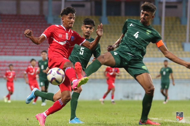 आज बिहीवार त्रिपुरेश्वरकाे दशरथ रङ्गशालामा भएकाे समूह ‘ए’ काे खेलमा नेपाल पाकिस्तानसँग १–० गाेलले पराजित भयाे । पाकिस्तानका लागि अली जफरले खेलकाे ७६ औँ मिनेटमा गाेल गरे । याे जितसँगै पाकिस्तानले ३ अङ्क जाेडेकाे छ । नेपालले अब शनिवार माल्दिभ्ससँग खेल्ने छ ।
