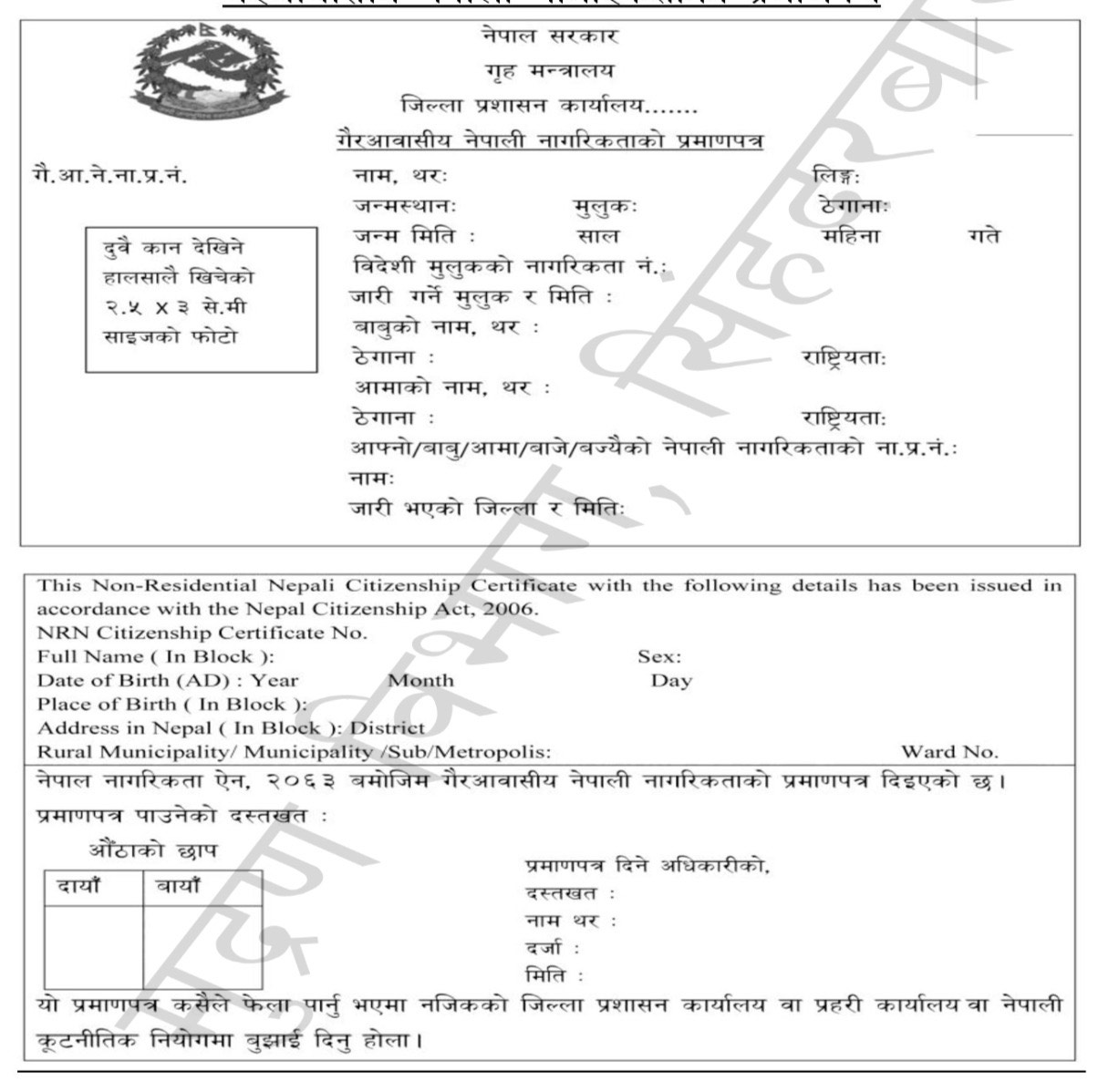 निवेदनमा निवेदकको नाताभत्रिको नेपाली नागरिकले र त्यस्तो नाता व्यक्ति नभएमा सम्बन्धित व्यक्तिलाई चिन्ने नेपाली नागरिकले सम्बन्धित प्रमुख जिल्ला अधिकारी वा तोकेको अधिकृत कर्मचारी समक्ष उपस्थित भई सनाखत गरिदिनुपर्नेछ । सो निवेदनलाई प्रमुख जिल्ला अधिकारीले छानबिन गरी त्यस्तो व्यक्ति गैरआवासीय नेपाली नागरिकता पाउन योग्य देखिएमा नागरिकताको प्रमाणपत्र जारी गर्नेछ ।